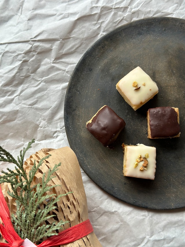 【冬季限定】冬の素材で楽しむ!冬のチョコがけスコーン 冬の素材を使ったひとくちサイズのスコーン 不知火の自家製ピールやマイヤーレモンの皮を生地を混ぜ込んだり、冬の素材を使ったスコーンになります。 ひとくちサイズだからちょこっとずつ食べたり、みんなでシェアして食べたり。 ラッピング付きなので贈り物やバレンタインにもおすすめです ーーーーーーーーーーーーーー 【ひとくちスコーン(チョコ)】9個入り×1袋 卵・乳製品不使用の全粒粉入りプレーンスコーンに、カカオ70%入りのクーベルチュール入りのショコレートをかけたチョコがけスコーン。 上にはゲランドの塩をぱらっとかけたほんのり塩も効かせています。 【ひとちスコーン(レモン&ホワイトチョコレート】9個入り×1袋 卵・乳製品不使用の生地にマイヤーレモンの果汁と皮を混ぜ込みました。 ふわっとレモン香るスコーンに、ホワイトチョコレートをかけ上にはピスタチオをのせたスコーン。 【シトラスショコラスコーン】9個入り×1袋 卵・乳製品不使用の生地に不知火の皮を自家製ピールにして混ぜ込みました。 チョコチップ入りのシトラス香るひとくちスコーン。 ※全ての商品に製造過程では乳製品は使用していませんが、原材料(チョコレート)の一部に乳製品が使用されているため、アレルギーの方はご注意ください。